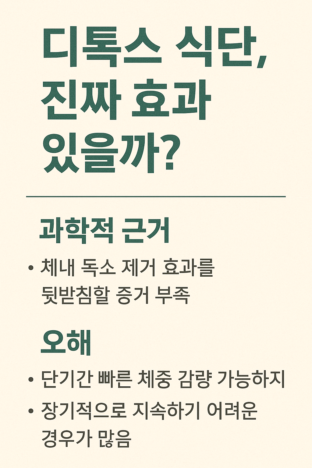 디톡스 식단은 체내 독소 제거와 건강 증진을 위해 많은 사람들이 시도하는 식이요법입니다. 하지만 과연 그 효과는 과학적으로 입증되었을까요? 본 글에서는 디톡스 식단의 개념, 실제 효과, 오해와 진실, 그리고 실천 시 주의사항을 종합적으로 살펴봅니다.