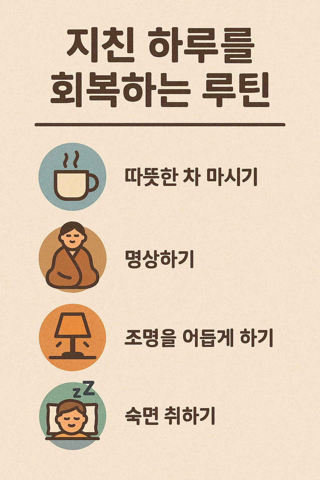 회복 루틴은 길거나 복잡할 필요가 없습니다. 샤워, 스트레칭, 짧은 일기, 책 한 페이지, 감정을 정리하는 5분. 이 작은 실천들이 쌓이면 내일의 에너지는 전혀 다른 양상으로 다가옵니다. 회복은 휴식보다 능동적인 행위이며, 자기 관리의 핵심입니다.