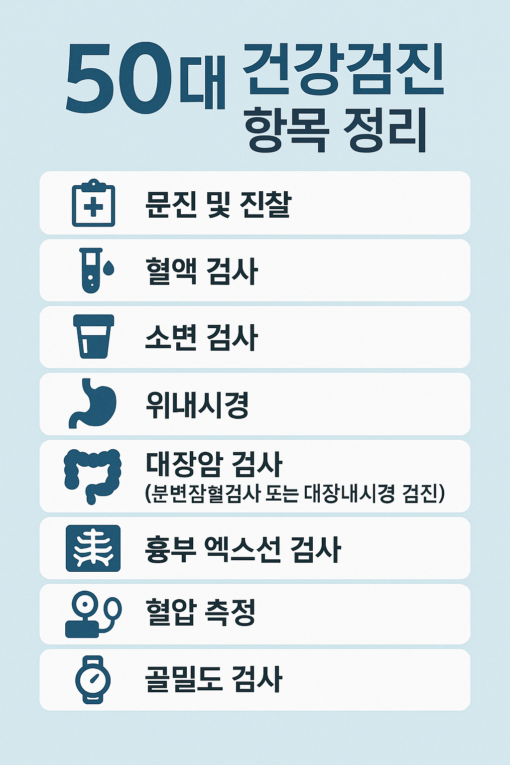 50대는 본격적으로 만성질환 발생률이 높아지는 시기로, 국가건강검진뿐 아니라 개인 맞춤형 정밀검사 항목에 대한 이해가 필요합니다. 본 글에서는 50대에 꼭 받아야 할 건강검진 항목들을 신체 부위별로 정리하고, 검사 주기 및 사전 준비사항까지 상세히 안내합니다.